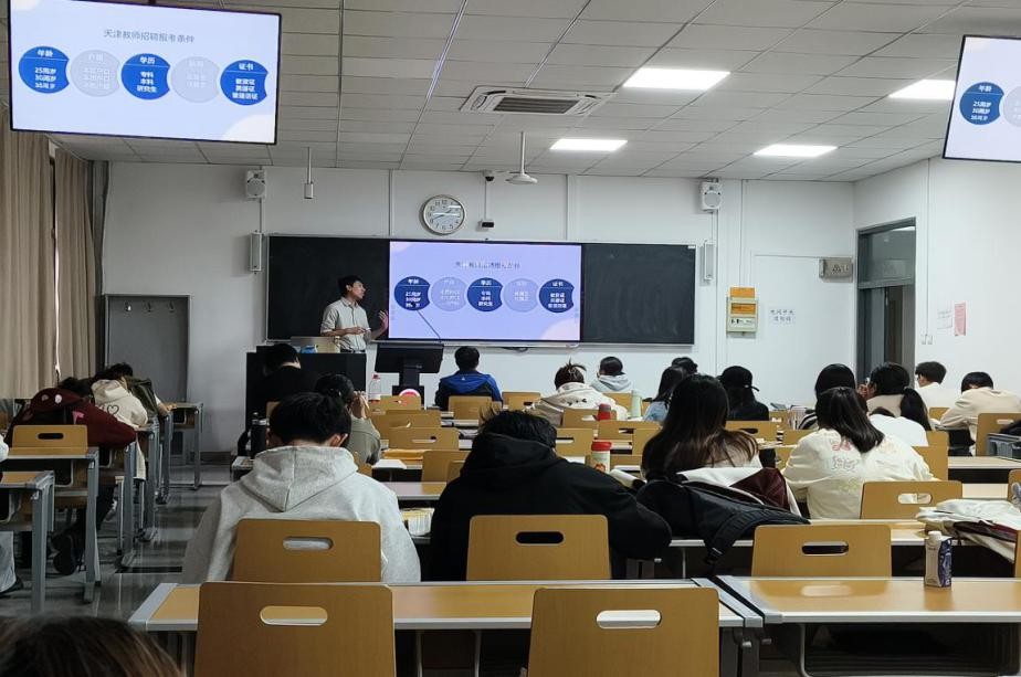 10月31日下午,学院在博理楼B100举办了关于“天津市2025年教师招聘规律机遇及趋势展望”就业指导会,邀请志鼎教育培训学校资深考情专家——苗雯月老师进行讲解。苗雯月老师围绕“2024年天津市教师编制考情”进行深入剖析,他结合自己多年工作经验,综合分析出2024年考编规律及2025年考情分析,向同学们分享了区招最新报考条件规律等。讲座中,苗老师与同学们积极交流互动,现场气氛十分活跃。