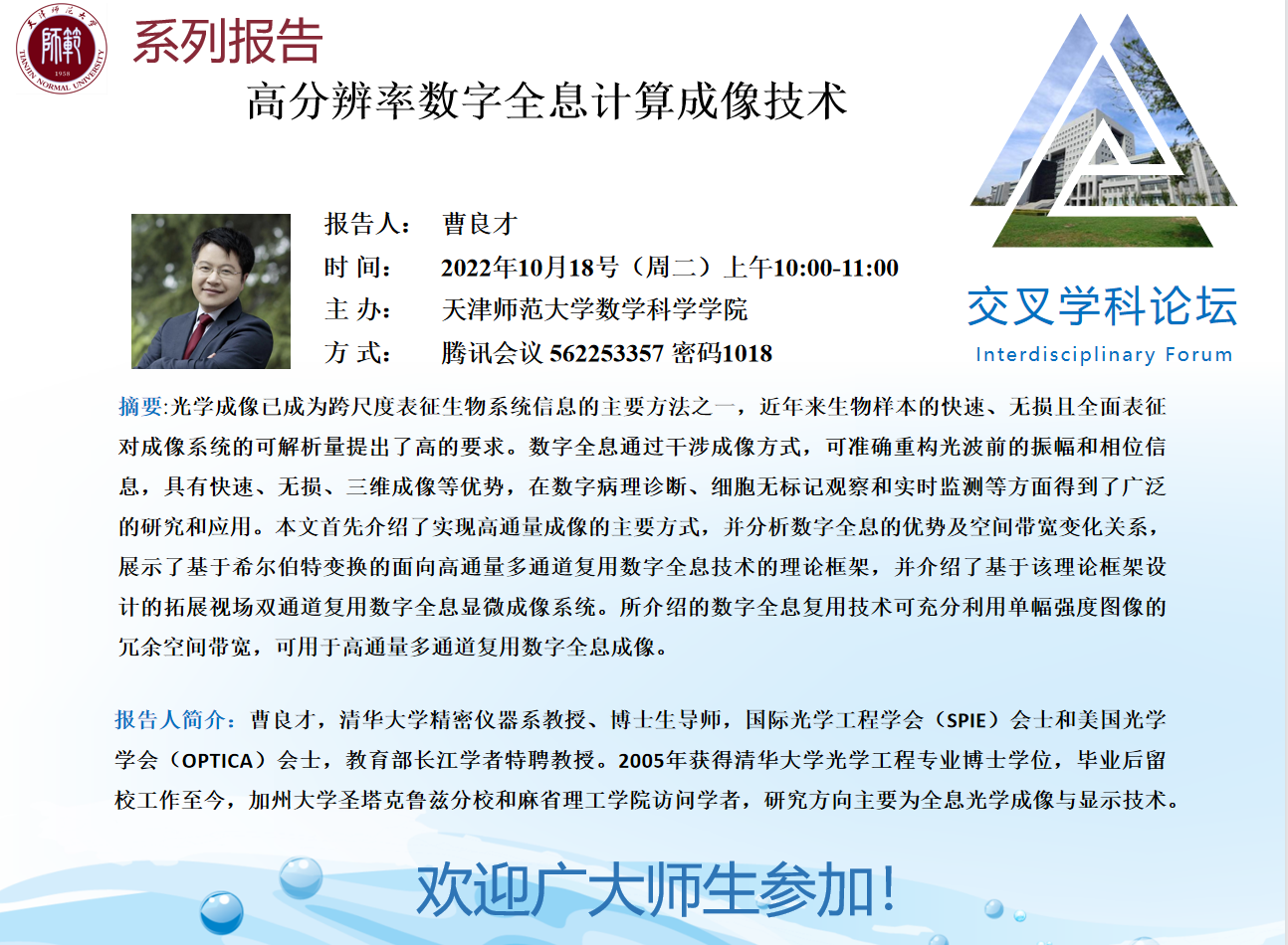 【预告】学术报告(2022-15)10月18日报告--高分辨率数字全息计算成像技术
