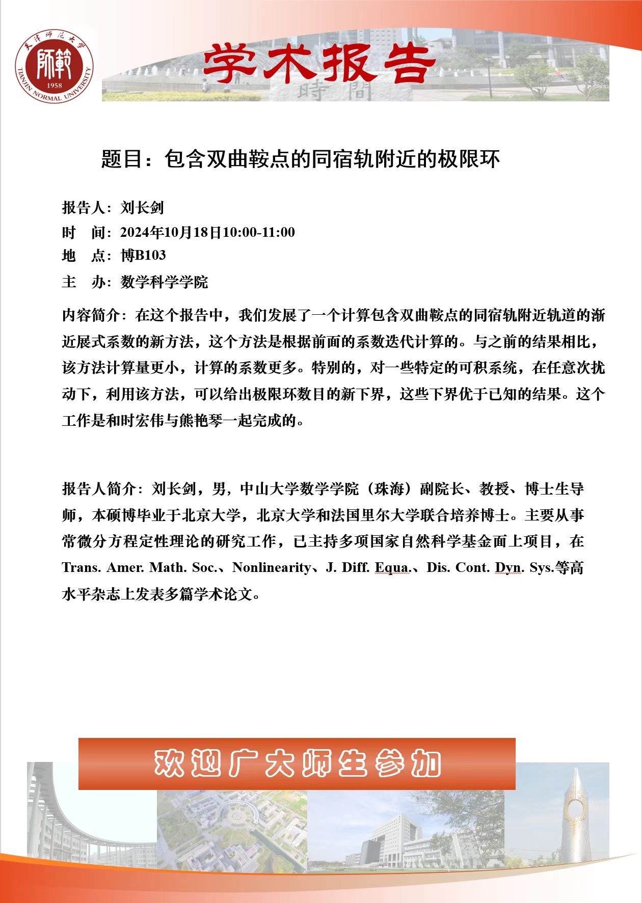 【预告】学术报告(2024-20)10月18日——题目:包含双曲鞍点的同宿轨附近的极限环
