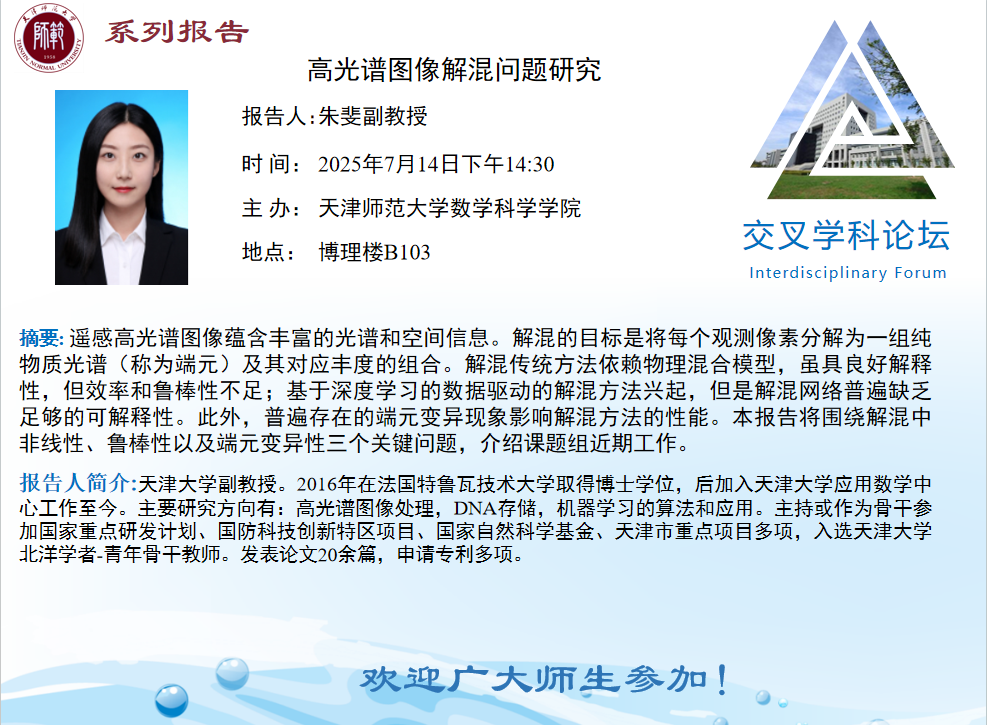 【预告】学术报告(2025-27)7月14日--高光谱图像解混问题研究