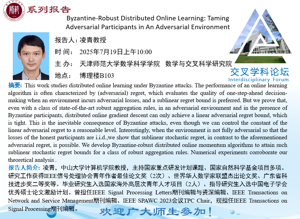 【预告】学术报告(2025-28)7月19日--Byzantine-Robust Distributed Online Learning:TamingAdversarial Participants in An Adversarial Environment