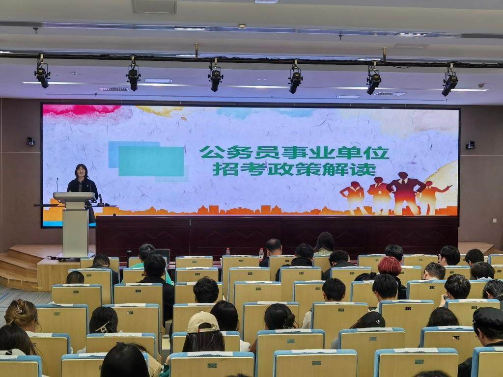 在就业政策宣讲会上,河东区人力资源和社会保障局副局长尚琳、河东区公共就业(人才)服务中心部长孙轶恺、中天人力中天人力毕业生服务部陶红辉、河东区公共就业(人才)服务中心副部长蔡玉欣分别就公务员事业单位招考和岗位选择、高校毕业生就业见习、毕业生档案、毕业生创业扶持等内容进行解读。来自德赢ac米兰官方合作、新闻传播学院、文学院的在校生共计200余人聆听宣讲会。